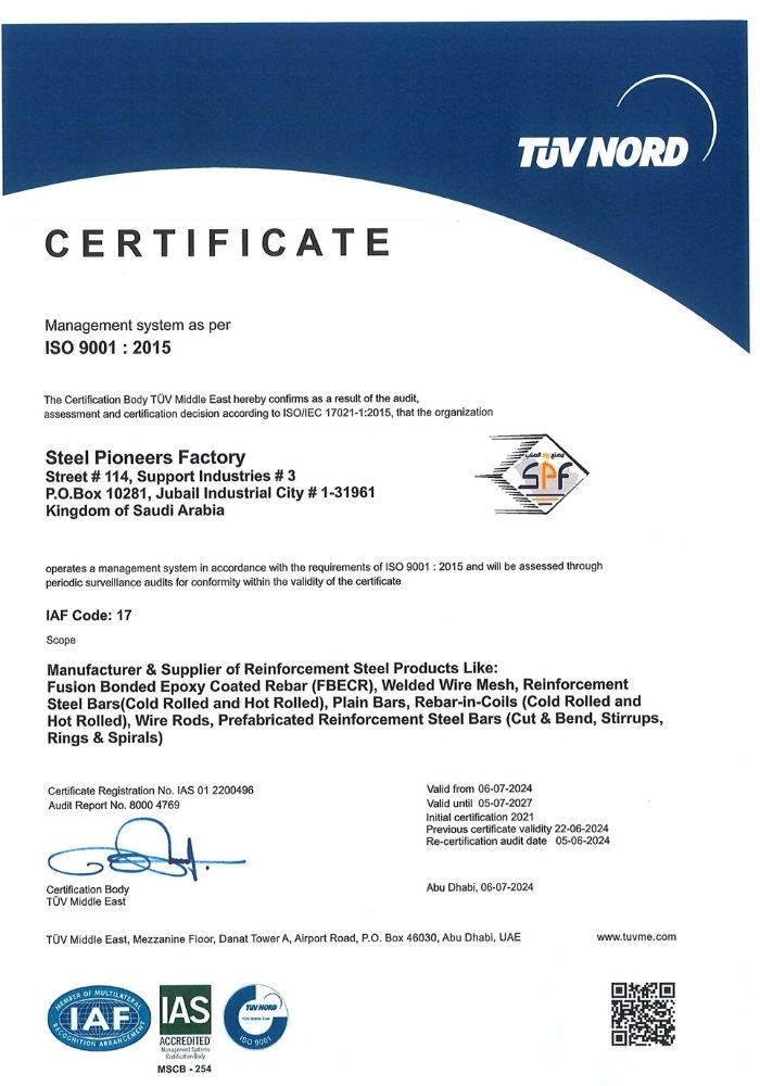 Steel Pioneers Factory adheres to ISO 9001, SASO Quality Mark, ASTM, BS, DIN, SSA-224, and SAE standards ensuring reliable, high-quality steel products.